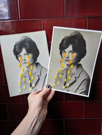 The original Vintage photo has been hand embroidered with 5 different shades of yellow thread in satin stitch to create the ombre effect lightning bolts.
