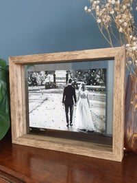 Would you like your keepsake photograph framed? Choose from a double glass wood effect floating frame, measuring 7.5 x 9.5 inch, or a white or black plain frame with mount, measuring 8.5 x 11 inch.