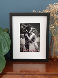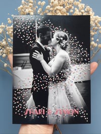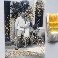 Hand embroidered french knots have been stitched through the photo in a sweeping design to give the impression of swirling confetti. The names of the couple have then been embroidered along the bottom.